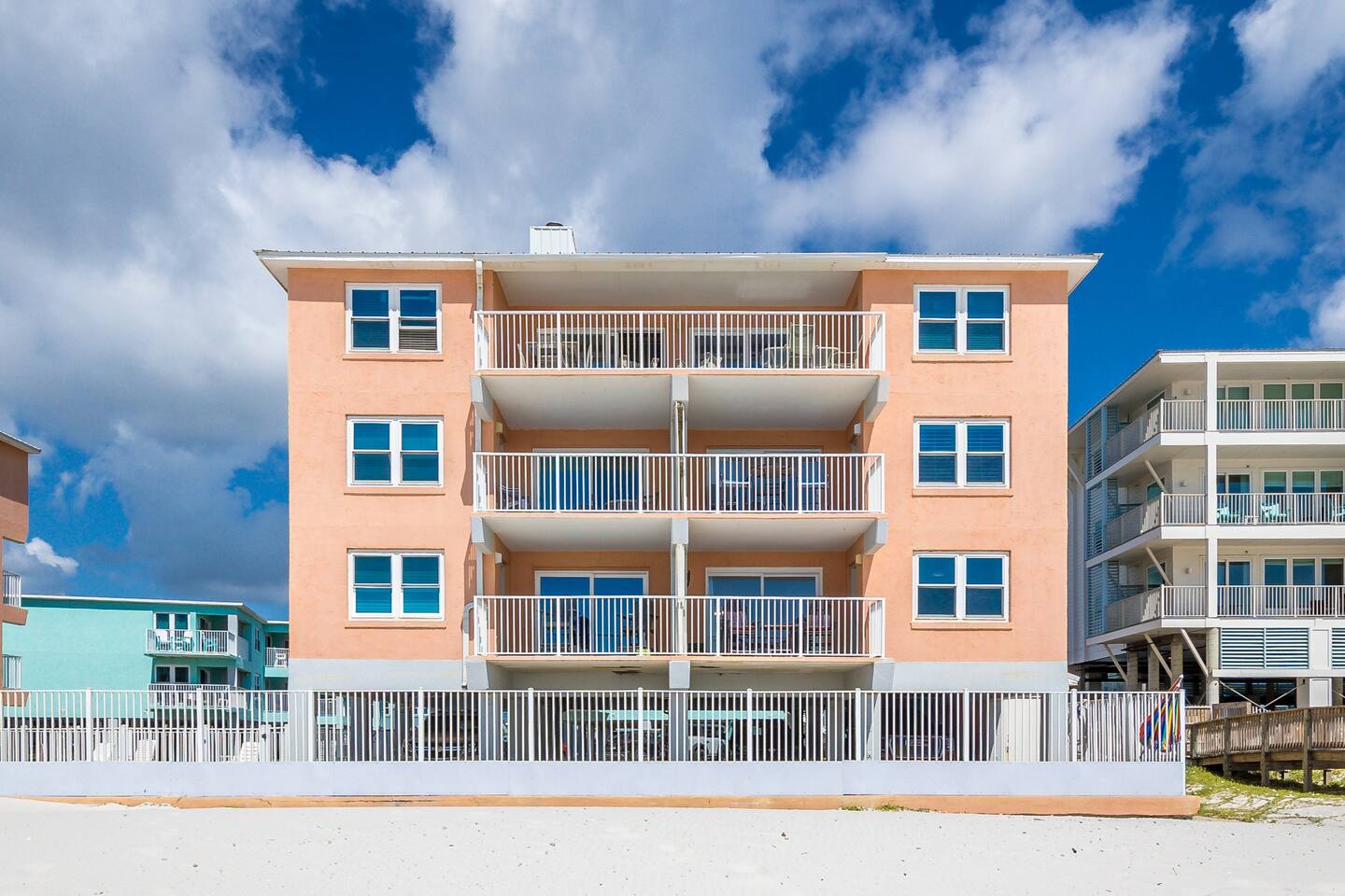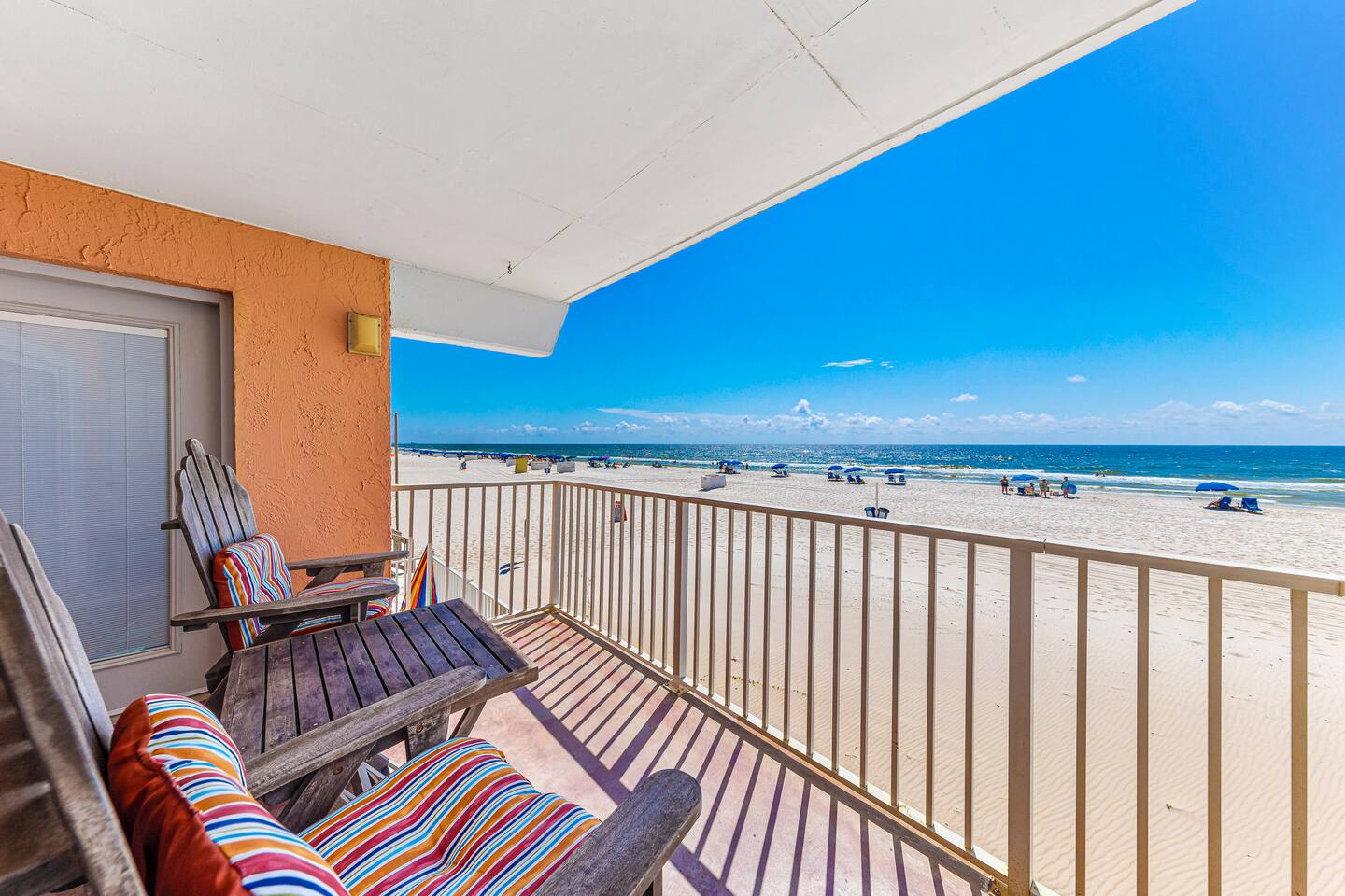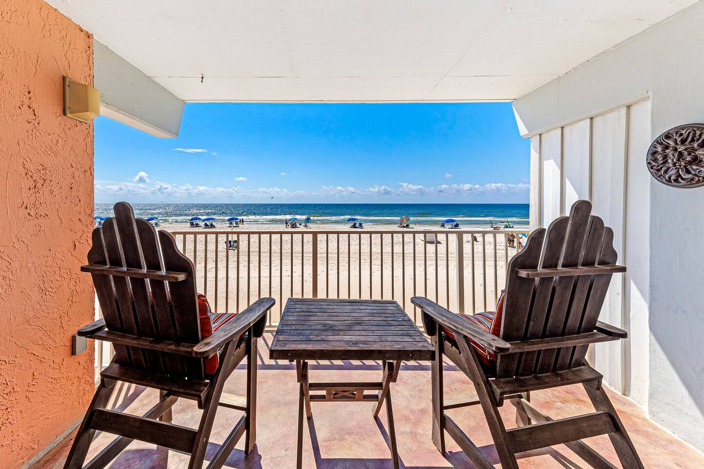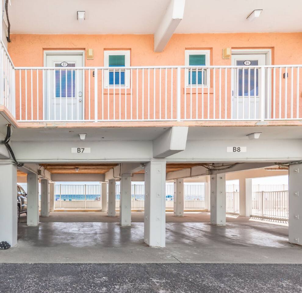 DIRECT BEACHFRONT Direct beachfront 2BR/2BA with king and queen beds plus sofa sleeper. Less than 1 min from the front door to the beach entrance! Fully stocked kitchen with spices, K-Cups, and more. Amenities include in-unit washer/dryer, WiFi, heated pool, BBQ area, and 2 covered parking spots. Key fob beach access and a short walk to The Hangout! Watch dolphins play while enjoying your morning coffee from the balcony. Free 2 Vehicle Covered parking