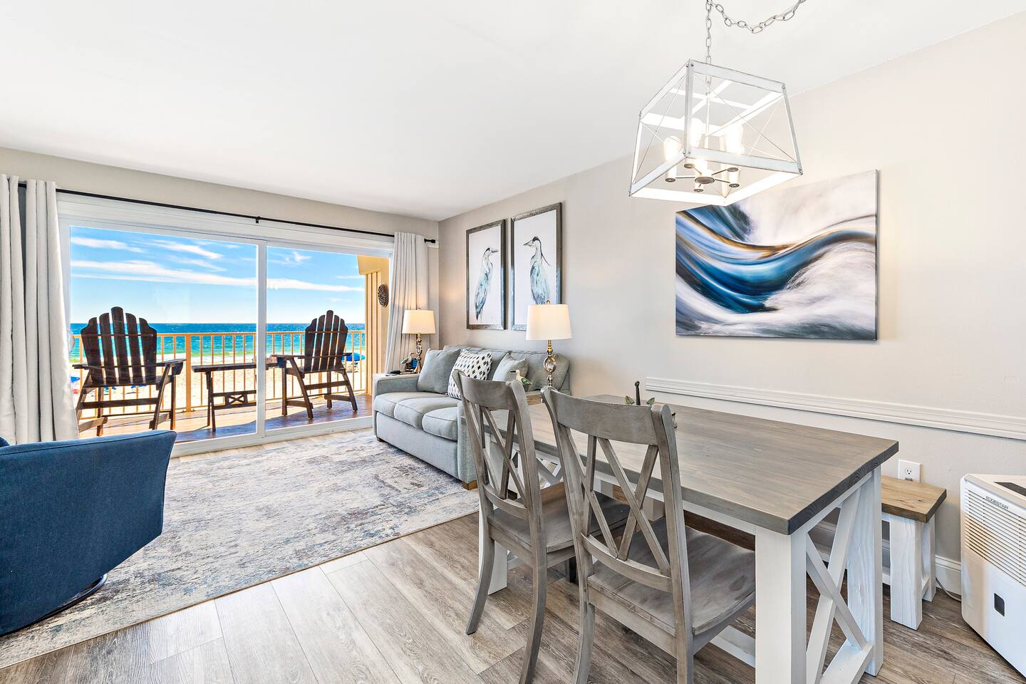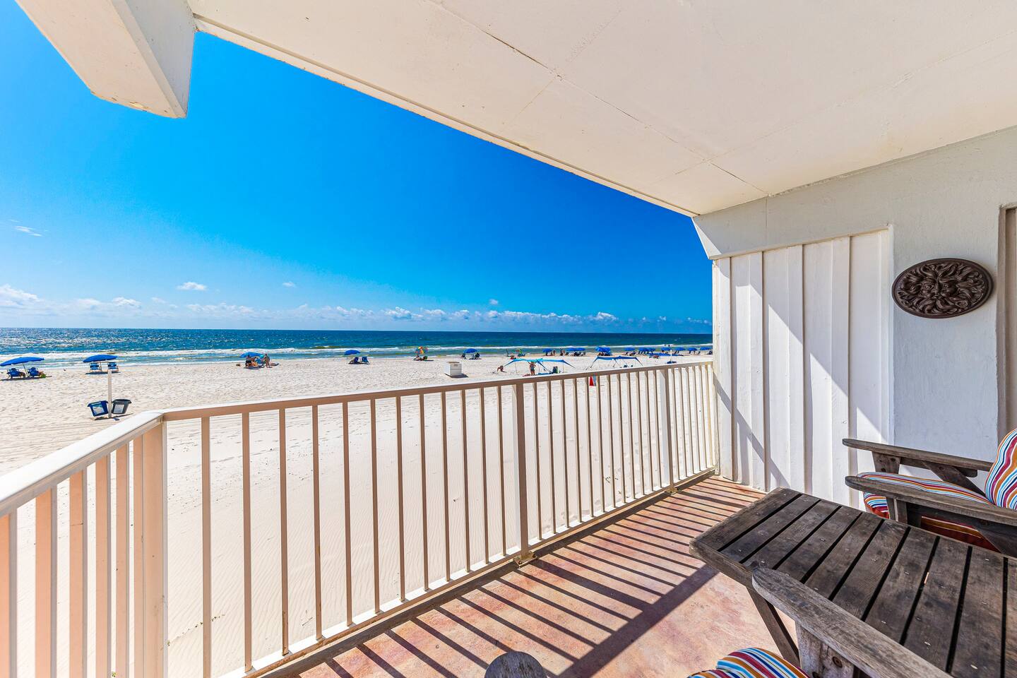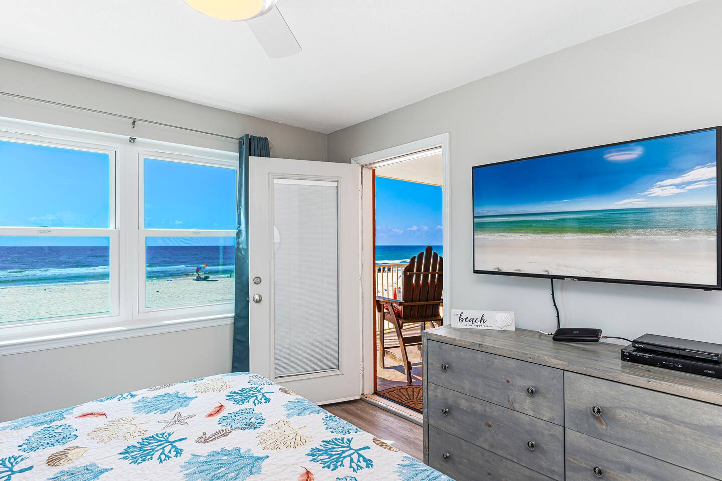 DIRECT BEACHFRONT Direct beachfront 2BR/2BA with king and queen beds plus sofa sleeper. Less than 1 min from the front door to the beach entrance! Fully stocked kitchen with spices, K-Cups, and more. Amenities include in-unit washer/dryer, WiFi, heated pool, BBQ area, and 2 covered parking spots. Key fob beach access and a short walk to The Hangout! Watch dolphins play while enjoying your morning coffee from the balcony. Free 2 Vehicle Covered parking