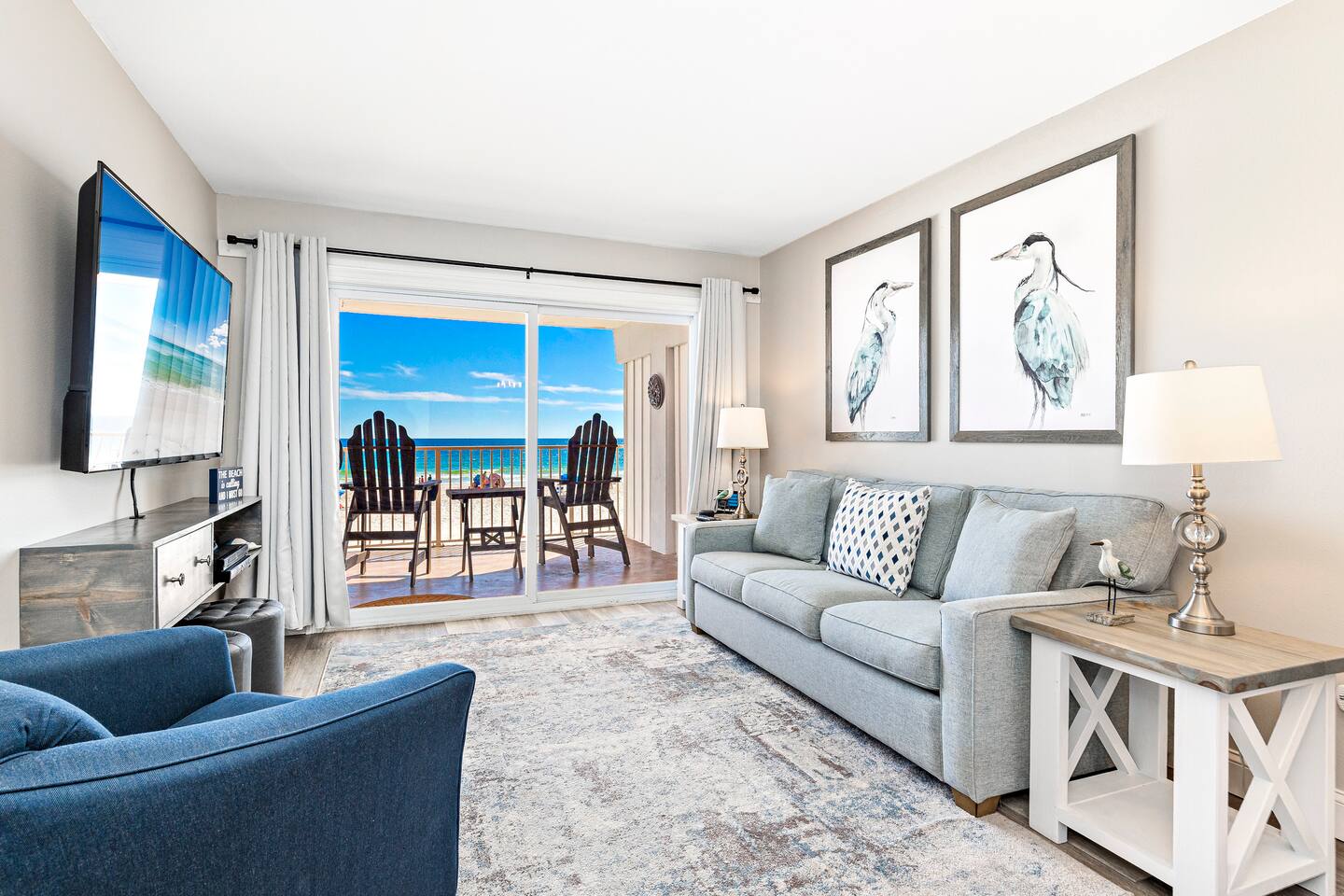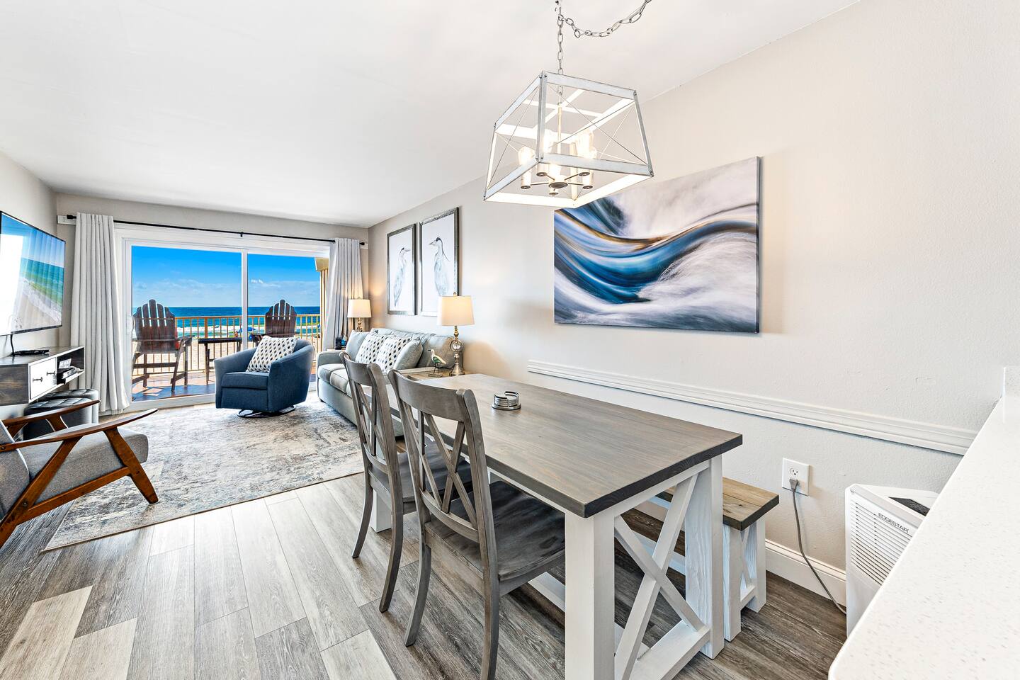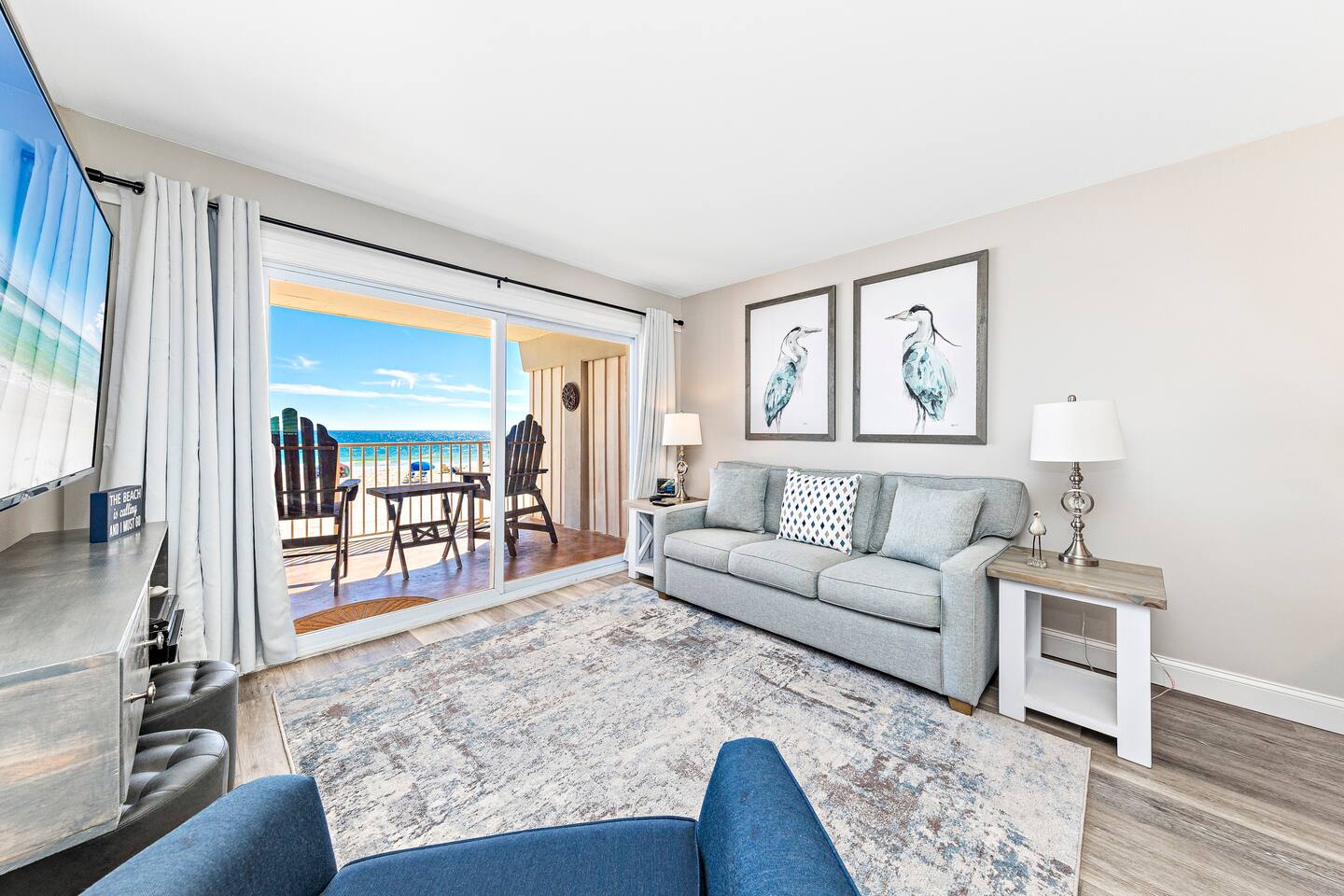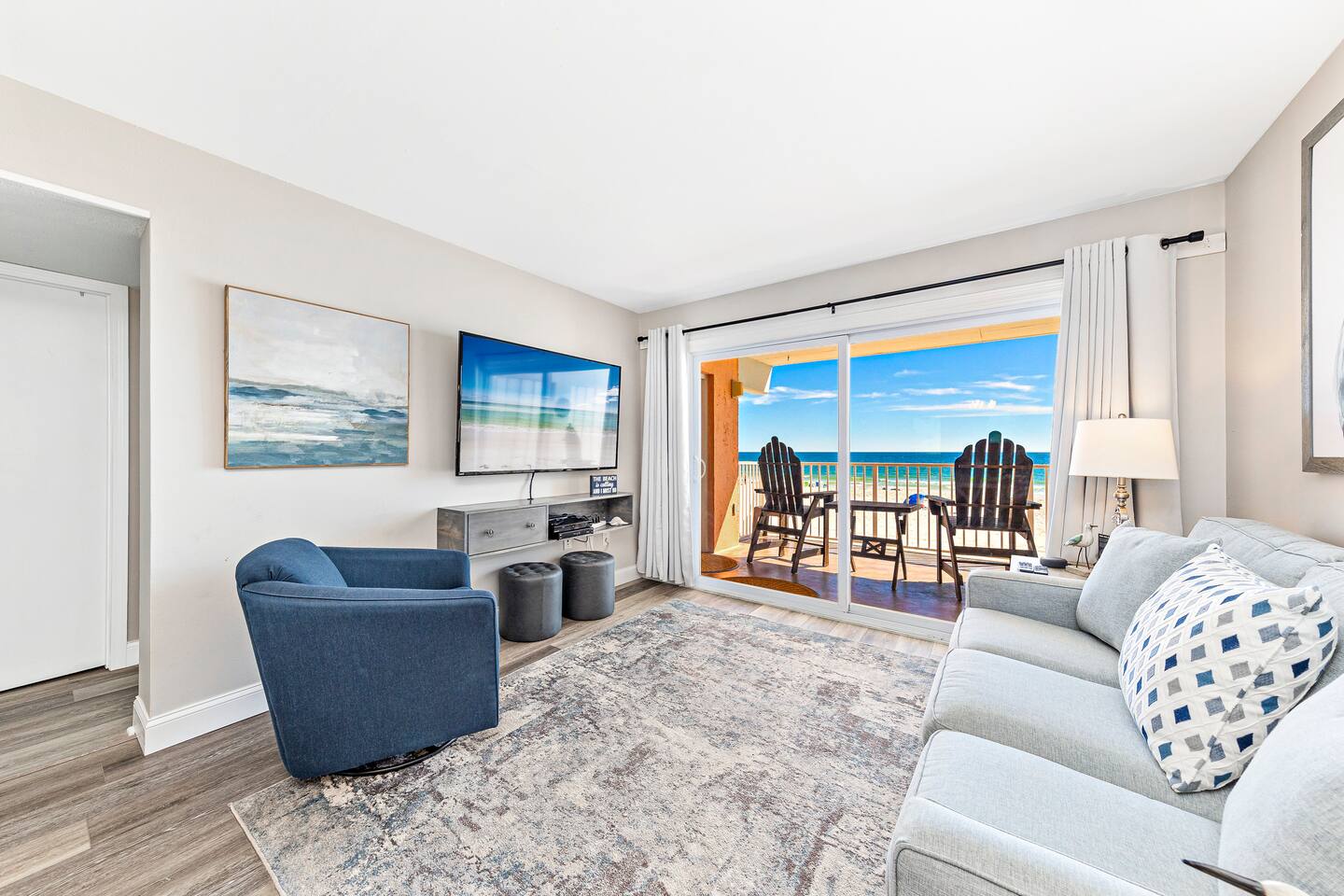 DIRECT BEACHFRONT Direct beachfront 2BR/2BA with king and queen beds plus sofa sleeper. Less than 1 min from the front door to the beach entrance! Fully stocked kitchen with spices, K-Cups, and more. Amenities include in-unit washer/dryer, WiFi, heated pool, BBQ area, and 2 covered parking spots. Key fob beach access and a short walk to The Hangout! Watch dolphins play while enjoying your morning coffee from the balcony. Free 2 Vehicle Covered parking
