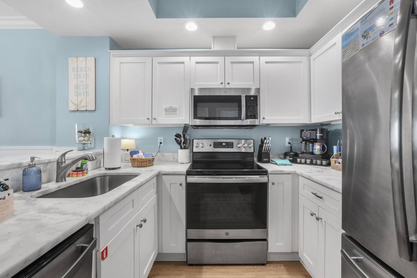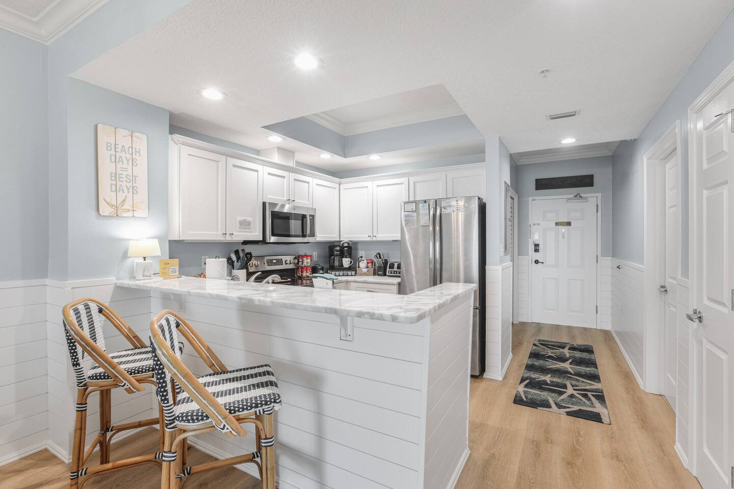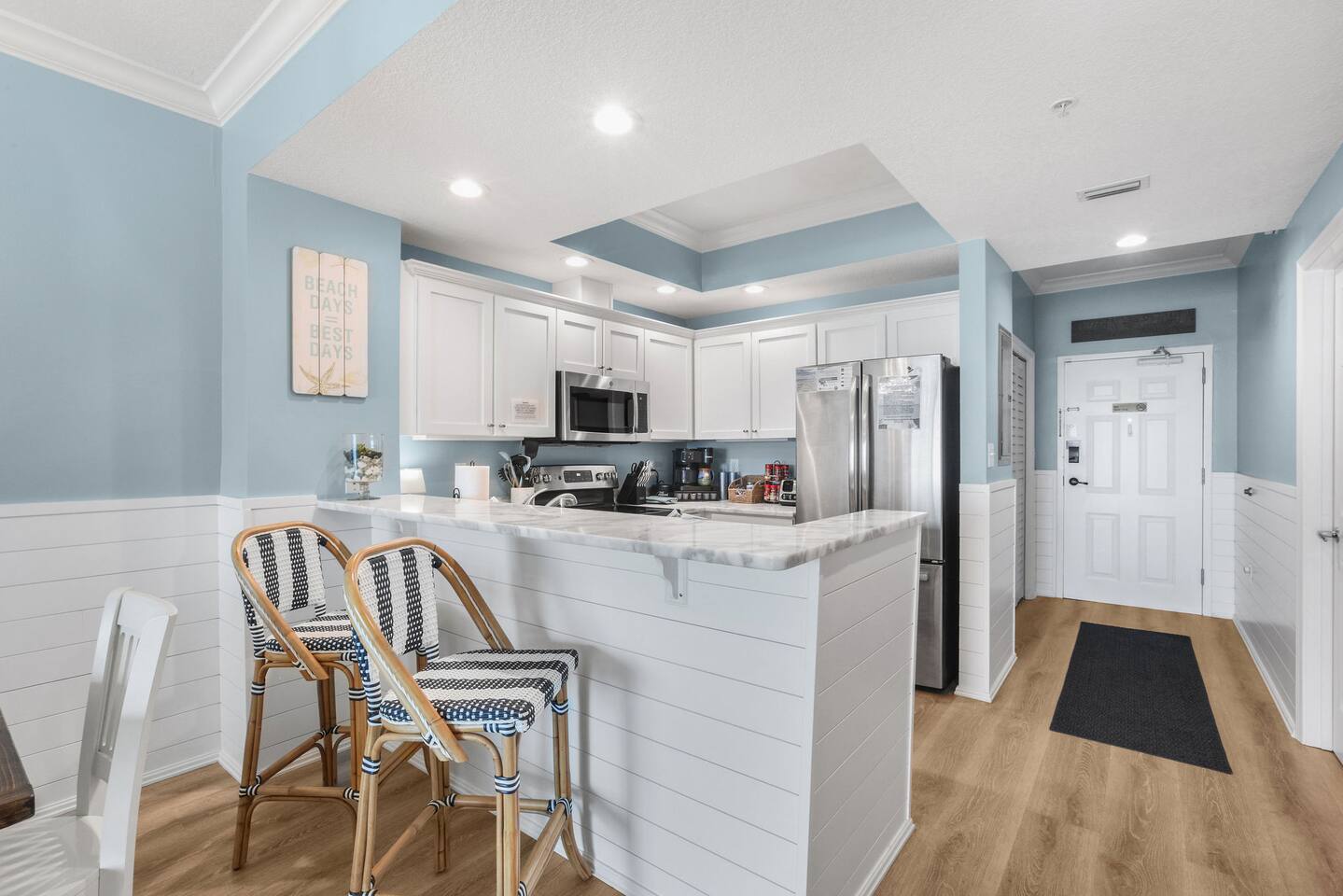 Crystal Shores offers the best of both worlds — direct beach access with resort-style amenities: indoor/outdoor pool, hot tub, sauna, gym, game room, BBQ area, elevators, and covered parking. Walk to The Hangout, shops, and dining in minutes!